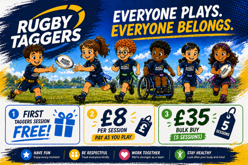 Rugby Taggers sessions are designed to introduce young children to rugby, underpinning the core fundamentals of rugby through fun and games.